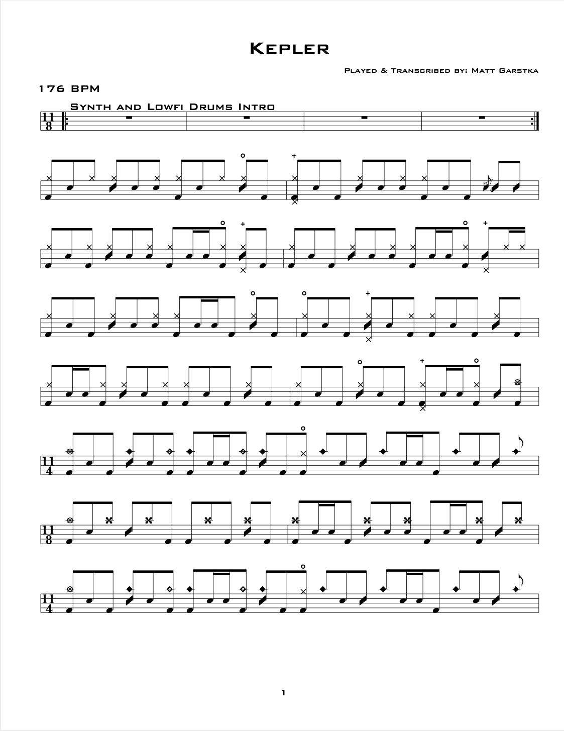 This is an exact transcription of the album performance of Kepler. It features many metric modulations, Quintuplets, septuplets and nontuplets. Included is a drum-less track and a click track so you can practice to it/play to it/do covers, whatever you heart desires.